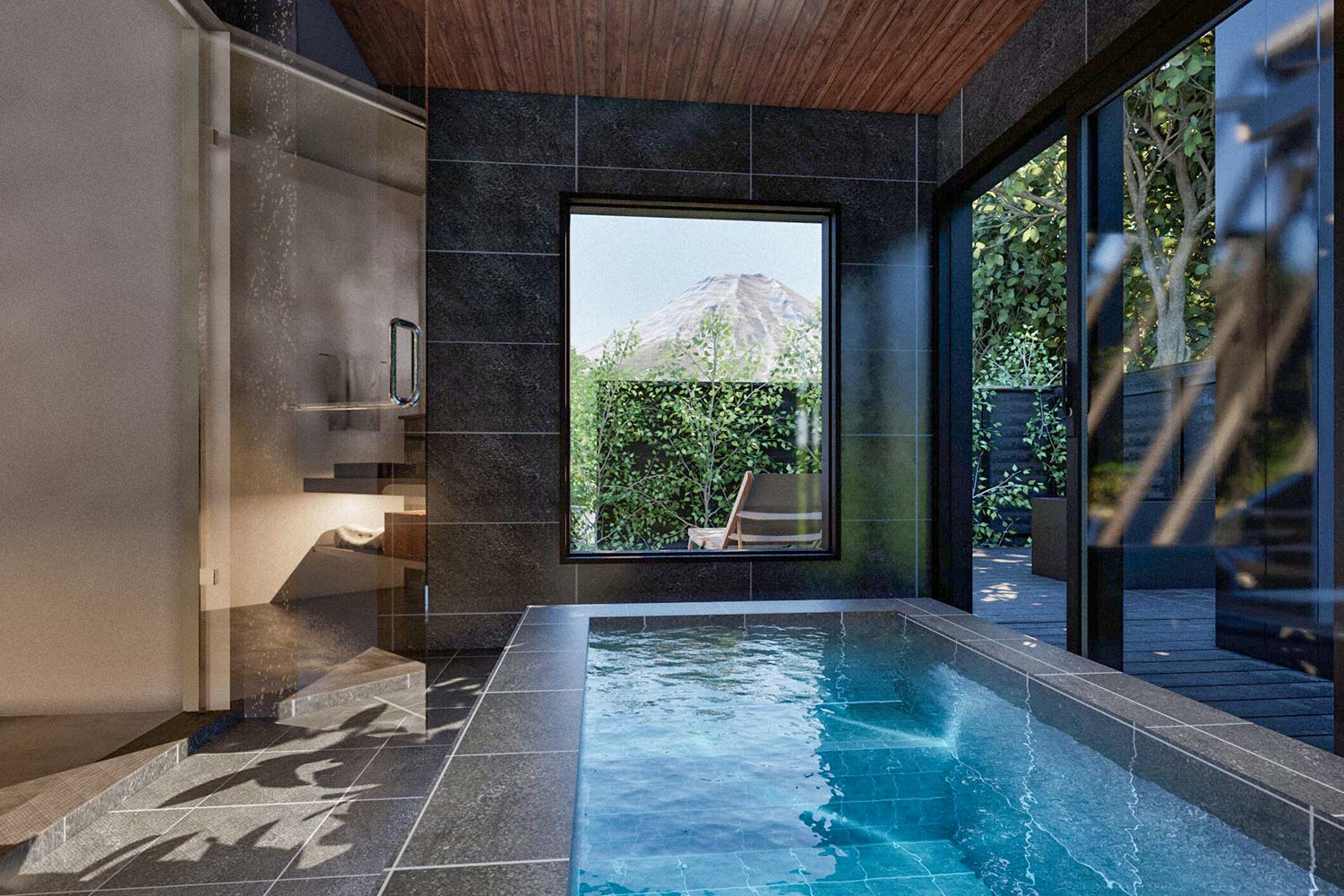 富士山深層水のバナジウム鉱泉を配湯した客室風呂やプライベートサウナを備え、どのお部屋からも富士山が一望できます。